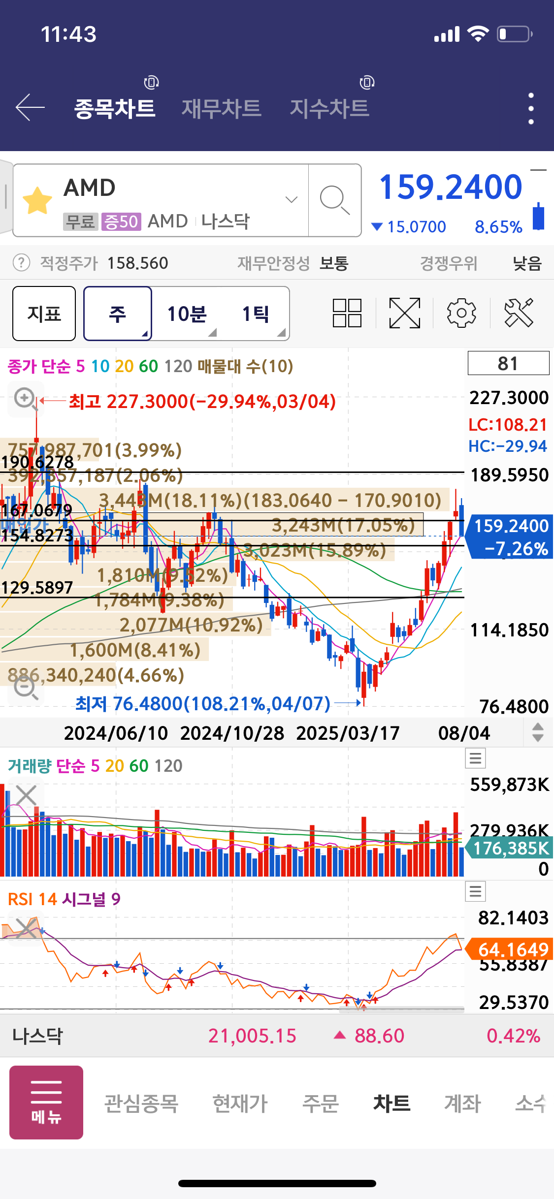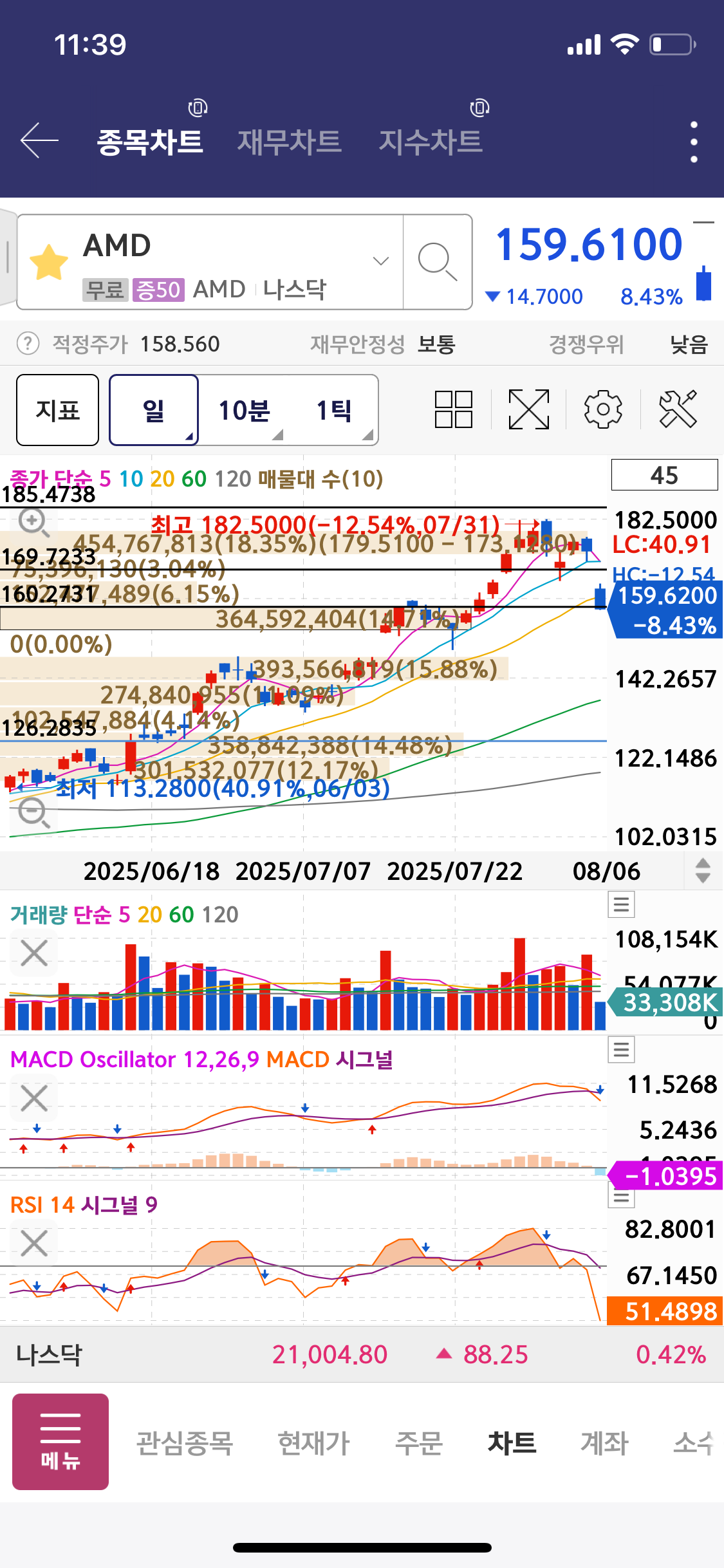매매기준: 20일평선에 닿아서 매수. AMD는 엔디비아 헷지개념으로 들고 가기 좋아서 매수. 10평선 부셔서 익절