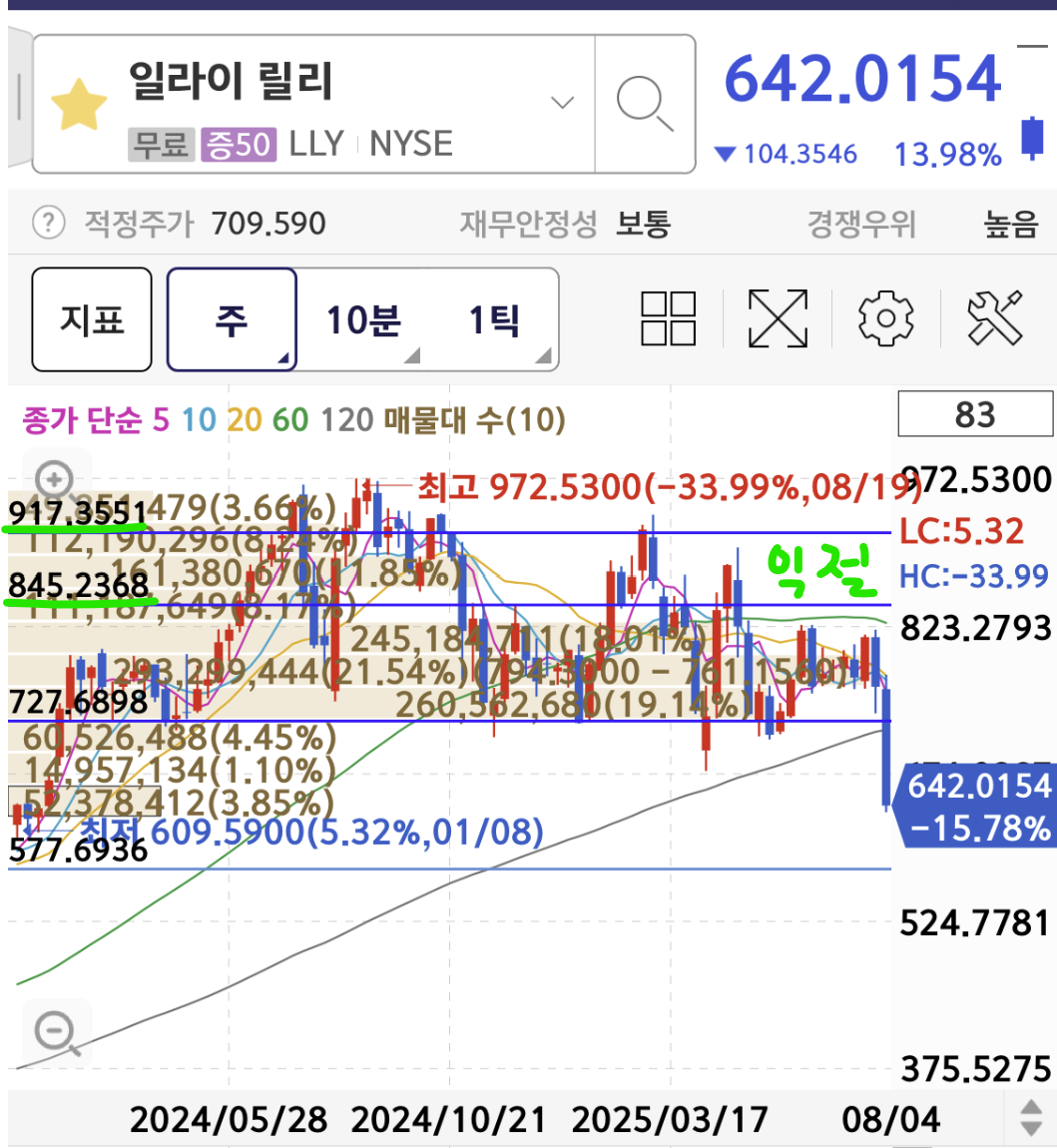 지금 판 이유는 S&P지수가 천장쯤에 왔고, 일라이릴리가 비슷한 제약회사 (노보노, 존앤존)보다 PER, PBR도 거의 10배가량 높음.(PER, PBR은 낮을 수록 저평가라서 좋은거임)