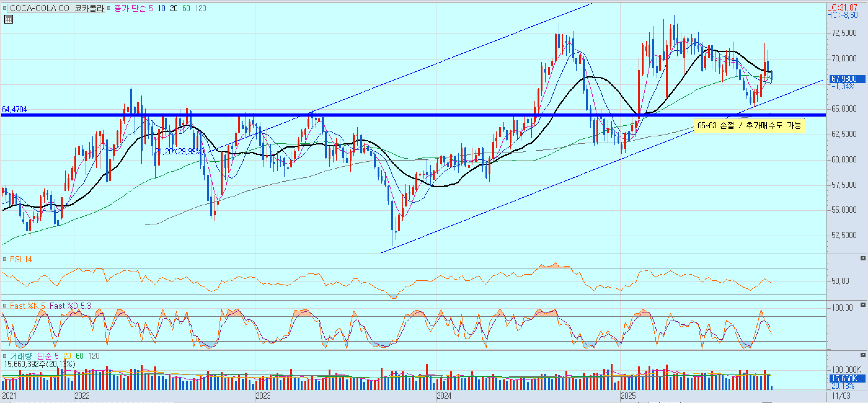 매매기준: 60주평선에 닿음. 향후 미장이 안좋아지면 코카콜라는 방어주 성격으로 괜찮을거같음